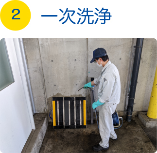 ![]() 種類ごとに高圧・高温水洗浄機で洗浄します。 |