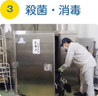 ![]() 高温加熱処理殺菌や、オゾン殺菌など、最適な消毒方法を、適用基準をもって消毒します。 |